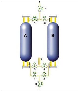 1、a塔进气阀 2、b塔进气阀 3、a塔放空阀 4、b塔放空阀 5、a塔出气阀 6、b塔出气阀 7、氮气出口阀 8、空气进气阀 9、排气消声器 工艺流程说明: 经过空气预处理系统处理后的洁净空气由8#,1#阀进入a塔,经a塔内的分子筛吸附后由5#,7#流出氮气,同时4#打开,b塔进行再生,当b塔再生完成后切换成b塔吸附,a塔再生,依此循环